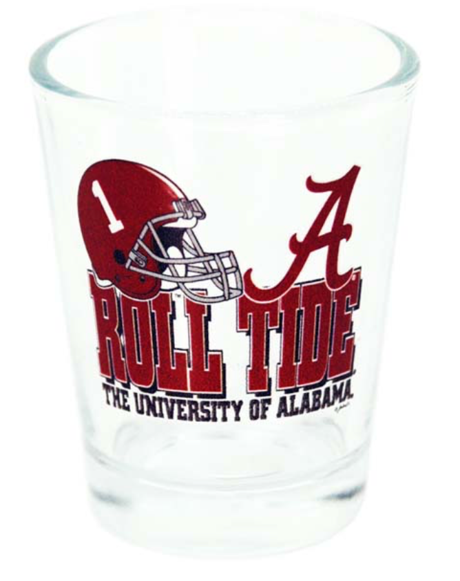 Alabama Shot Glass with Roll Tide Helmet and script A design showing your University of Alabama Pride!!