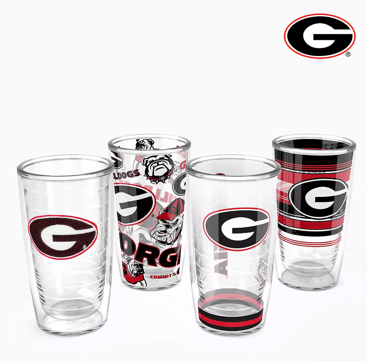 Get ready to cheer on the Dawgs with this 4-pack of UGA Tervis tumblers. Each 16oz tumbler includes a Tervis lid and features a classic University of Georgia Bulldog design. Keep your drinks at the perfect temperature while you're enjoying tailgates, parties, or just showing off your UGA pride! Go Dawgs!