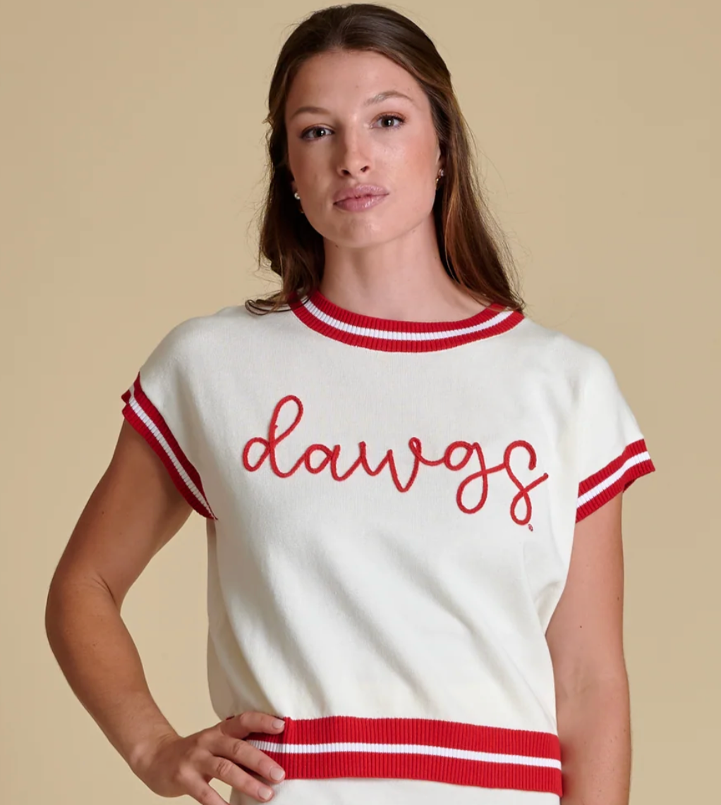 This cap-sleeve sweater channels old-school varsity style with updated rope embroidery and bold team color accents at the neck, sleeves, and hemline. Crafted from a soft acrylic-cotton blend, it offers a nostalgic yet elevated take on game day dressing. Pair it with wide-leg jeans or our matching skirt for a fresh spin.