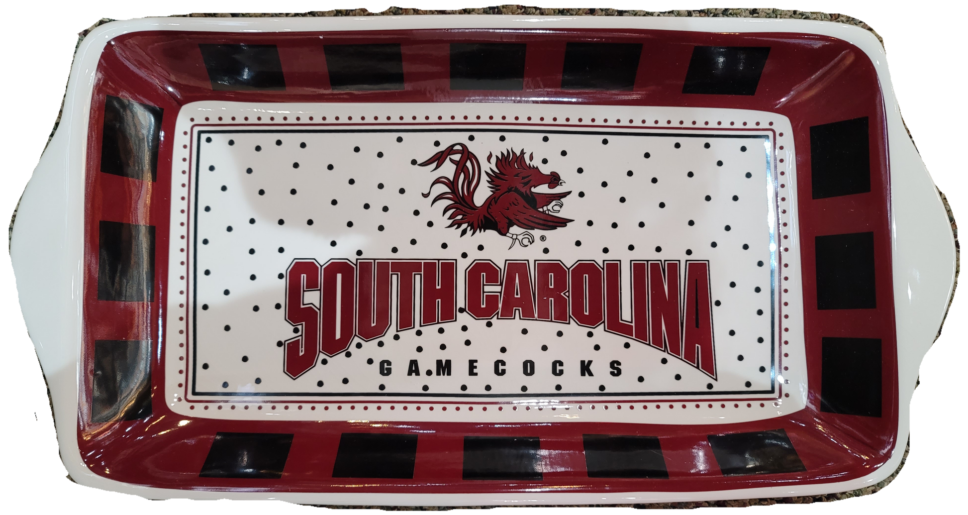 Elevate your hosting game with the University of South Carolina ceramic platter. Perfect for any gathering, this platter features the iconic USC Gamecocks logo and is durable for all your favorite dishes. Impress your guests with this stylish and practical addition to your tailgate! Dishwasher and microwave oven safe.